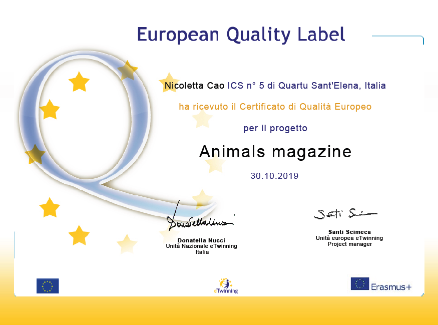La nostra scuola ha ottenuto il Certificato di Qualità Europeo per l’eccellente qualità del lavoro sul progetto eTwinning "Animals magazine". Ciò significa che il lavoro dei docenti e quello degli tudenti sono stati riconosciuti ai massimi livelli europei. I progetti saranno   inseriti in un’area speciale del Portale europeo all’indirizzo www.etwinning.net.
