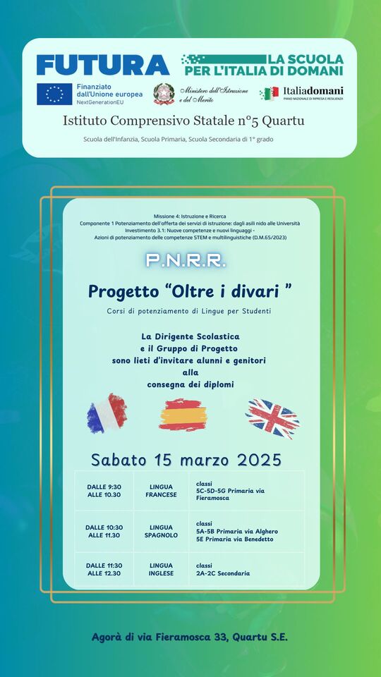 Il giorno 15 marzo 2025  consegneremo il Diploma del percorso di Lingue del PNRR 3.1 DM65 agli e alunne delle classi quinte della scuola primaria e della 2A e 2C della scuola secondaria di I grado.