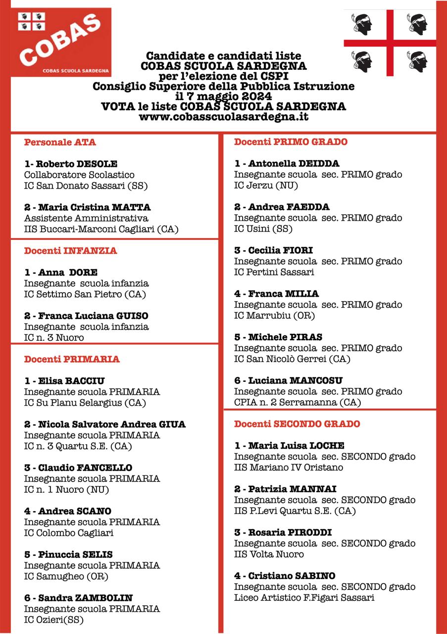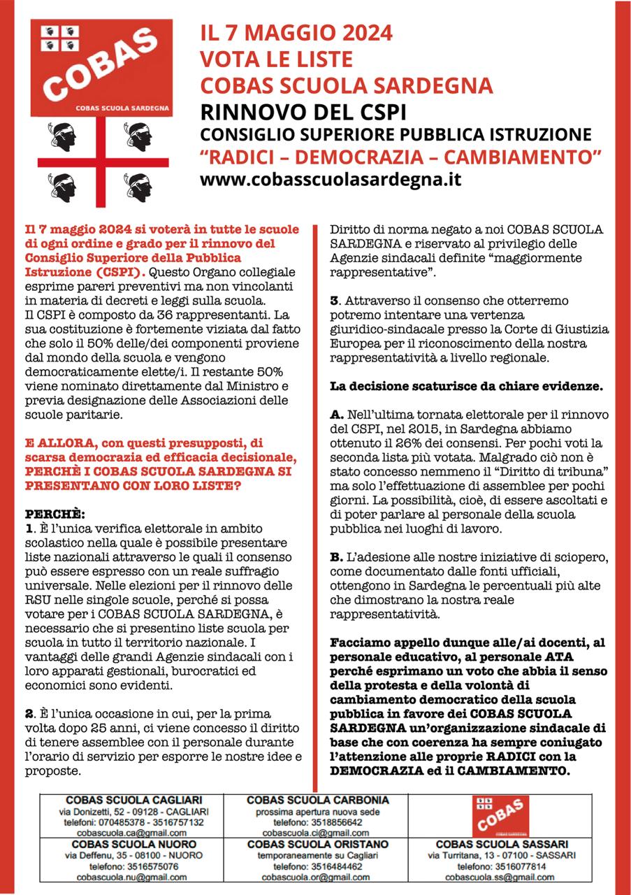 COBAS SCUOLA SARDEGNA materiali elezioni CSPI di martedì 7 MAGGIO 2024