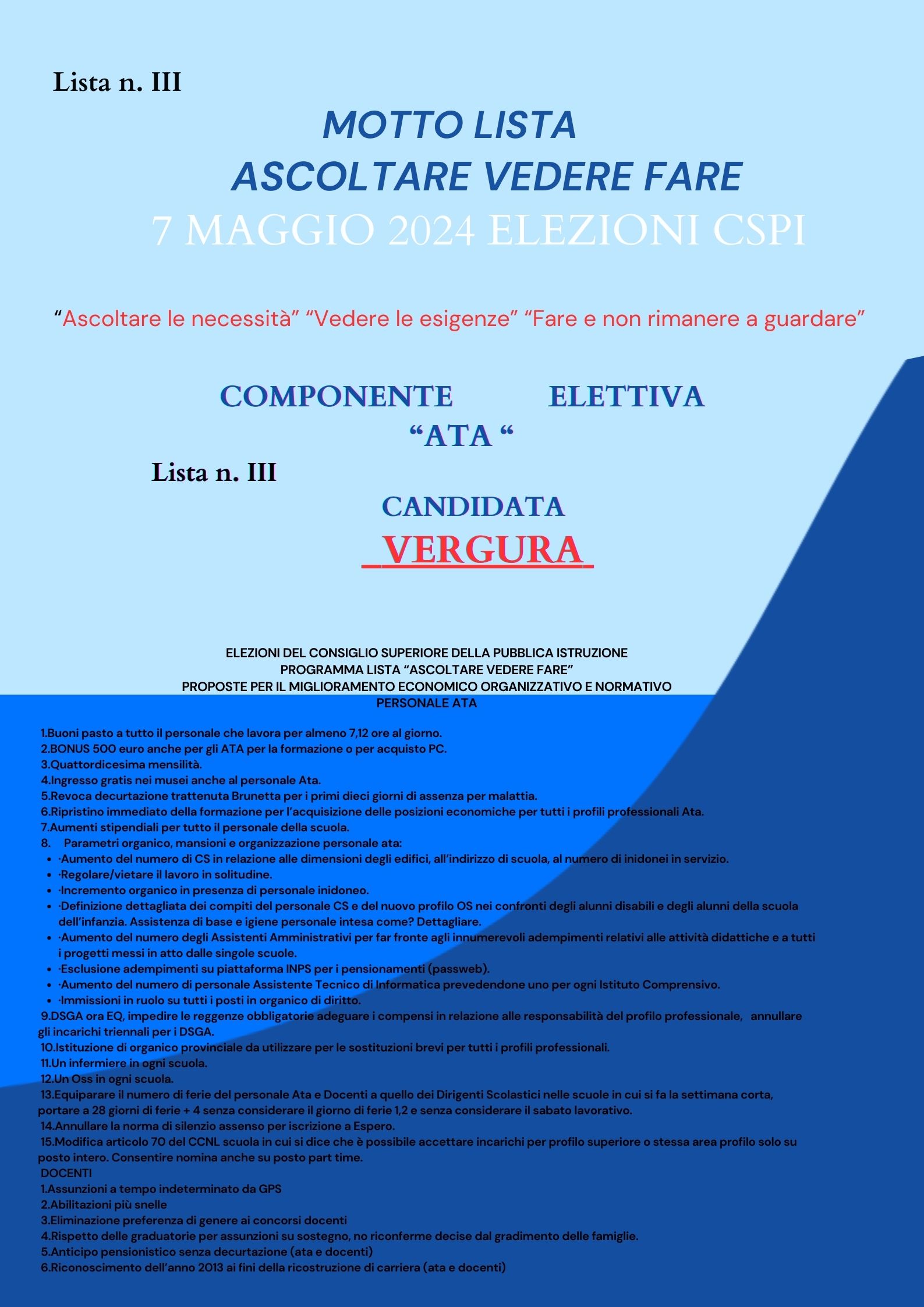 Lista componente Ata, motto Ascoltare Vedere Fare candidata VERGURA Maria Mattea Marilena