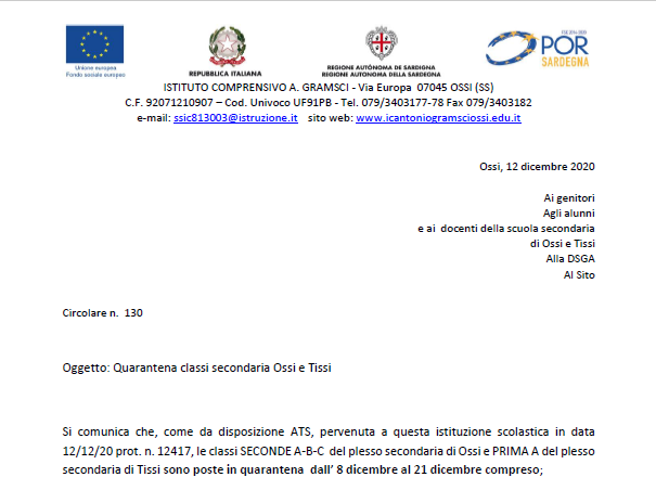 Circ. n. 130 - Quarantena Scuola Secondaria di Ossi e Tissi
